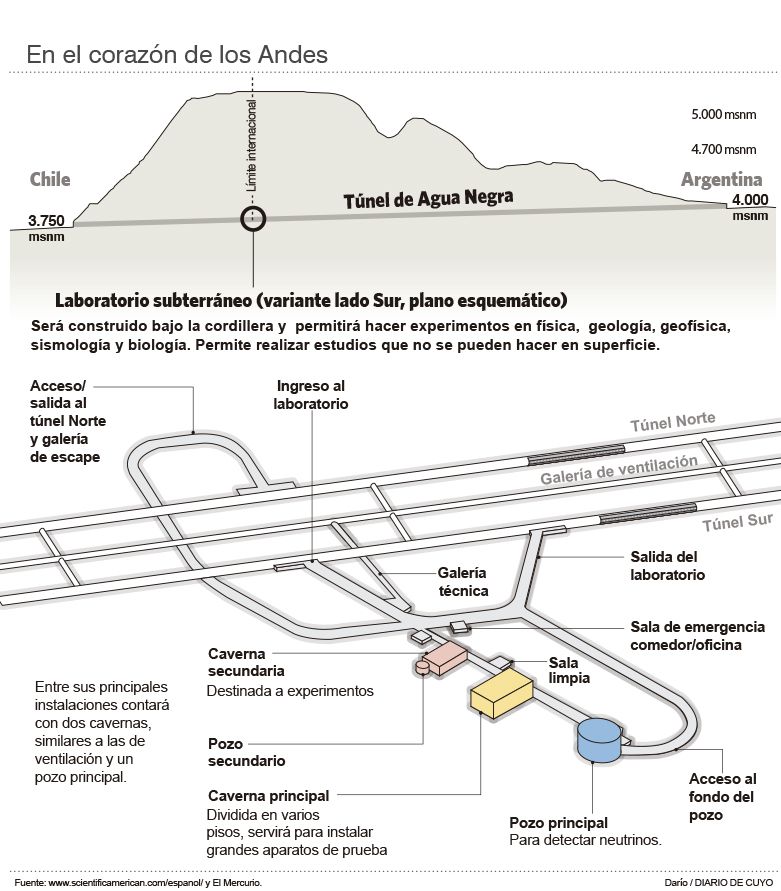 Se trata del ámbito en el que los últimos premios Nobel de Física realizaron sus estudios y podría estar en plena montaña, junto al Túnel de Agua Negra, pero hace falta que los gobiernos de Argentina y de Chile acuerden su construcción. Para llevar adelante el laboratorio científico Andes, que servirá para hacer experimentos de alta sensibilidad, la decisión de nuestro país ya está, según dijo ayer el ministro de Infraestructura, Julio Ortiz Andino, pero falta la definición en el país trasandino. Por eso en su exposición, en el marco del Primer Congreso Binacional de Investigación Científica, el funcionario exhortó a que se apure la resolución del otro lado de la cordillera porque debe ser tomada antes de que comience la obra del túnel.