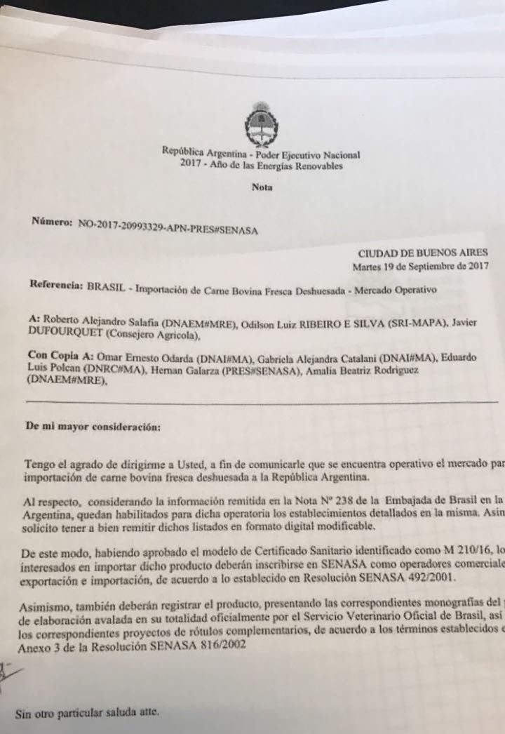 "Se encuentra operativo para la importación de carne bovina fresca deshuesada a la República Argentina", dice el texto aprobado por la entidad, y remitido a las autoridades brasileras, para que los interesados comiencen los trámites para la comercialización.