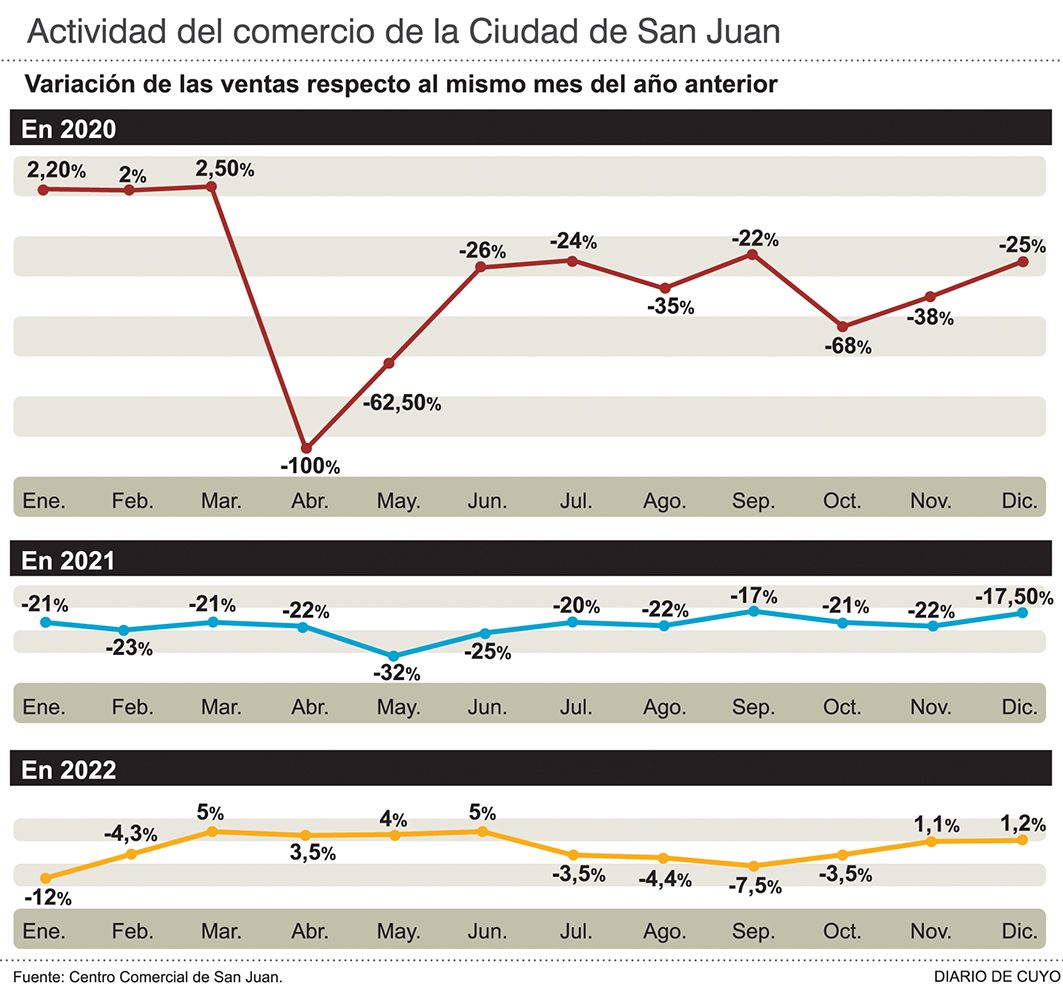 Un informe del Centro Comercial de San Juan reveló que durante el año pasado hubo una caída del 15,4% de las operaciones, medidas en unidades. Y que el rubro más afectado fue el de los artículos electrónicos, incluidas computadoras y celulares, motivado en las dificultades de importación y por la fuerte alza del dólar. Laura Zini, titular de la entidad, dijo que después de tres años, la actividad todavía no alcanza a recuperarse, después de los graves efectos que dejó la pandemia del covid-19.