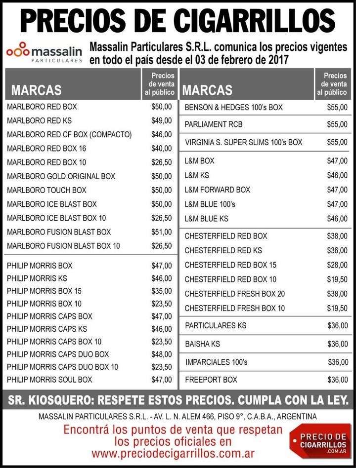 Según el nuevo cuadro de precios publicado por la empresa, su producto líder, Marlboro, pasará de costar 47 pesos a 50 en su formato BOX, y la común, se irá de 46 a 49 pesos.