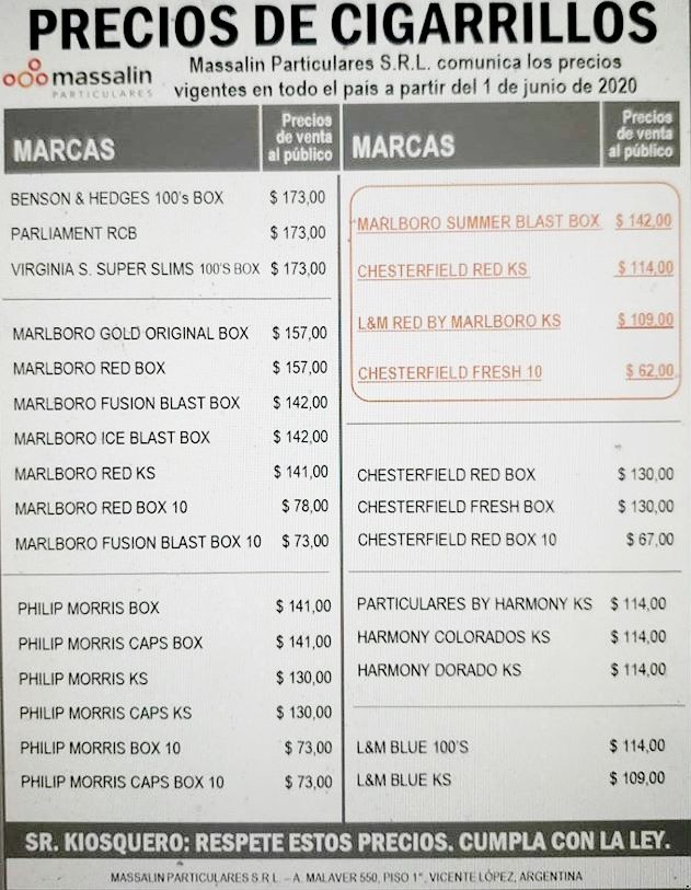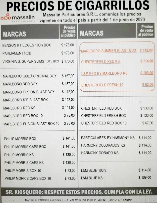 Según se conoció a nivel nacional, la suba responde a un incremento programado del impuesto interno mínimo, que se encareció un 7,8% a partir de este mes y que alcanzó los $68,56 por atado de 20 cigarrillos. Por eso, se espera que la otra gran tabacalera, BAT – Nobleza Piccardo, aplique incrementos similares.