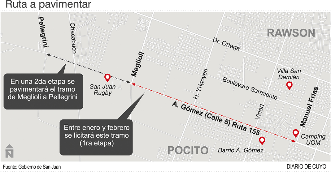 Se trata de una vía de comunicación estratégica en la zona Oeste de San Juan y la quieren licitar en el primer bimestre de este año. Es la modernización de la calle 5, también llamada Agustín Gómez, en la que la intención es ampliar para que llegue hasta la calle Pellegrini, en Rivadavia, y que sirva como otra puerta de acceso al Parque Industrial Tecnológico Ambiental (PITAR).