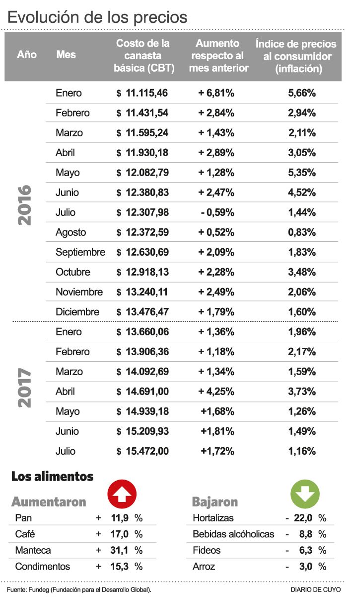 25,7 por ciento es la inflación acumulada en los últimos doce meses en San Juan, según Fundeg. A nivel nacional sería del 21,3 por ciento para el mismo período, según Indec.