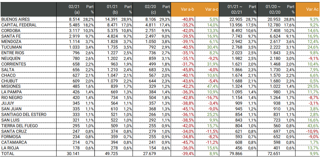 En cuanto a las ventas de vehículoas 0Km, hay un salto del 9,9% en el acumulado enero-febrero 2021 con erspecto a igual periodo del año anterior. En la provincia, el porcentaje de crecimiento fue un tanto más bajo, de el 3,8%.