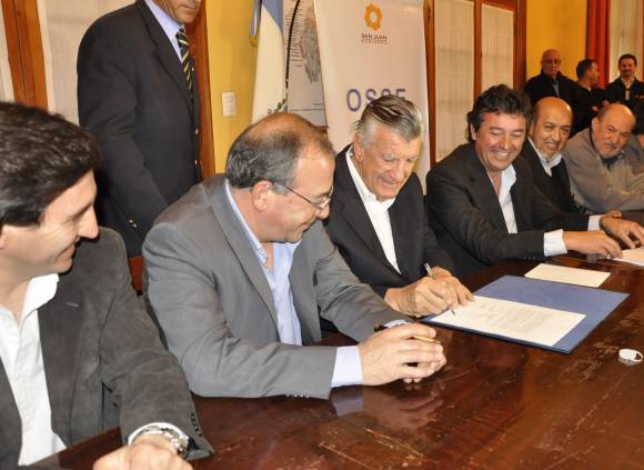 Durante un acto que tuvo lugar ayer en Casa de Gobierno, con la presencia del gobernador José Luis Gioja, del ministro de Infraestructura José Strada, el intendente Barifusa, el titular de OSSE Cristian Andino y el presidente de la Cámara Minera Jaime Bergé, entre otras autoridades, se firmaron los acuerdos de financiamiento con las empresas mineras (ver aparte).