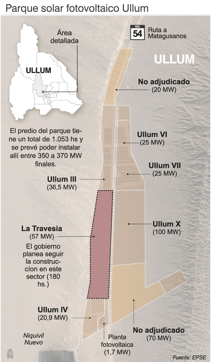- El nuevo parque solar se pretende desarrollar en el predio del Parque Solar Ullum, un gran diseño en el departamento del mismo nombre que se está desarrollando a través del EPSE exclusivamente para parques solares fotovoltaicos. Todo el predio tiene 1053 hectáreas en total y se prevé poder instalar allí entre 350 a 370 MW finales. Se encuentra dividido en diferentes lotes en manos privadas en diferentes instancias, y allí también esta la planta solar piloto de EPSE que fue ampliada el año pasado y genera energía para abastecer a 850 hogares. San Juan cuenta con un tercio del total de la energía solar del país del programa RenovAr: 550 MW de un total de 1.700 MW.