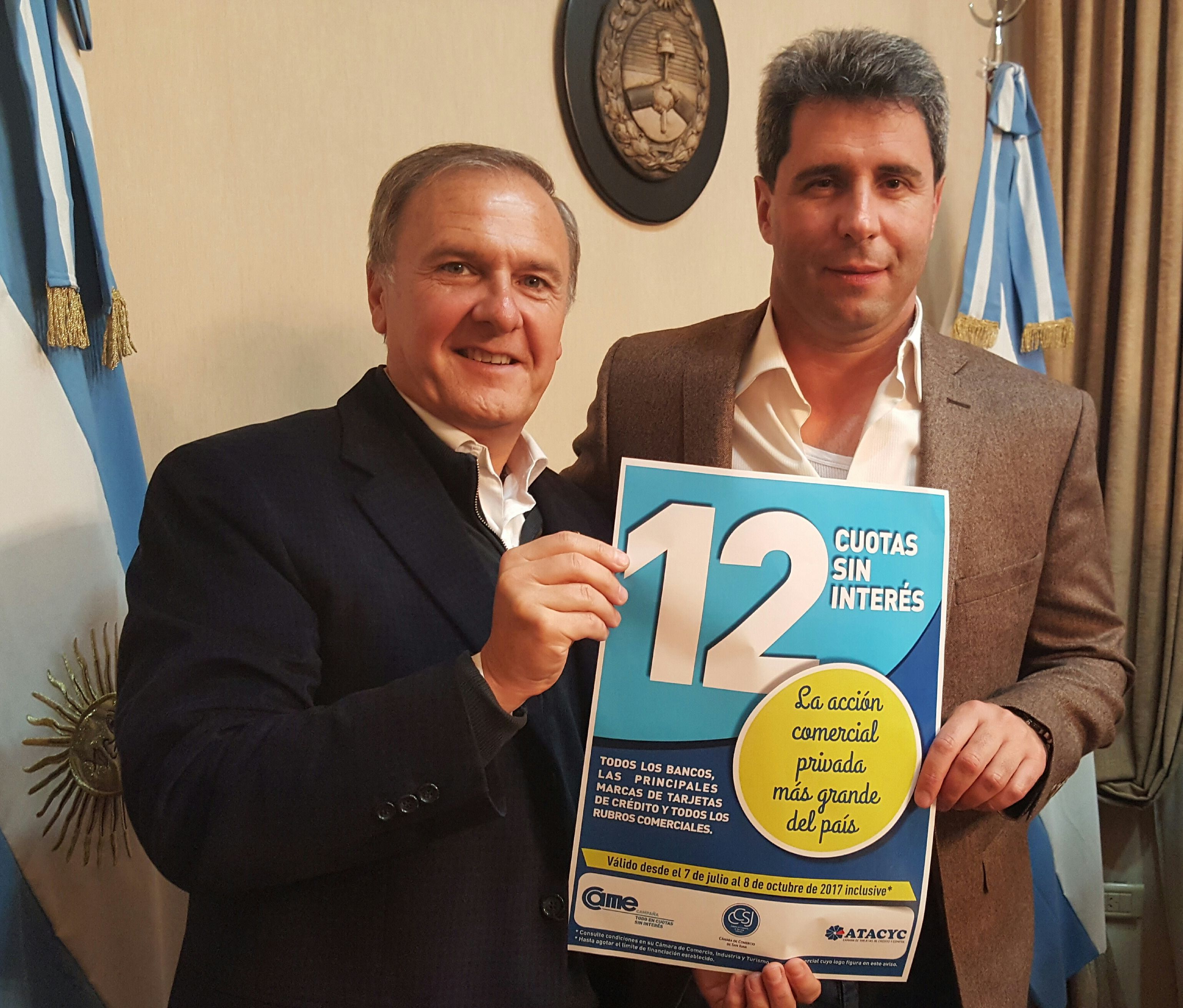 El secretario general de CAME, José Bereciartúa junto al gobernador Uñac celebraron ayer la inclusión de San Juan al plan de 12 cuotas todos los días todos los rubros. Esta iniciativa es sólo para 75 ciudades de frontera de todo el país y en la provincia beneficia a Capital, Rawson, Santa Lucía, Chimbas y Rivadavia. Para contrarrestar el ‘efecto Chile‘ el directivo le pidió apoyo a Uñac para difundir el plan para salvaguardar al comercio local frente a la falta de competitividad con el país vecino. El beneficio rige desde el 7 de julio y hasta el 8 de octubre, con las tarjetas Visa, Mastercard, Cabal y Américan Expres. Para que se extienda desde el 9 de octubre al 6 de enero de 2018 la provincia deberá eliminar el régimen de retención de Ingresos Brutos a las operaciones realizadas con Tarjetas de Crédito y Débito.