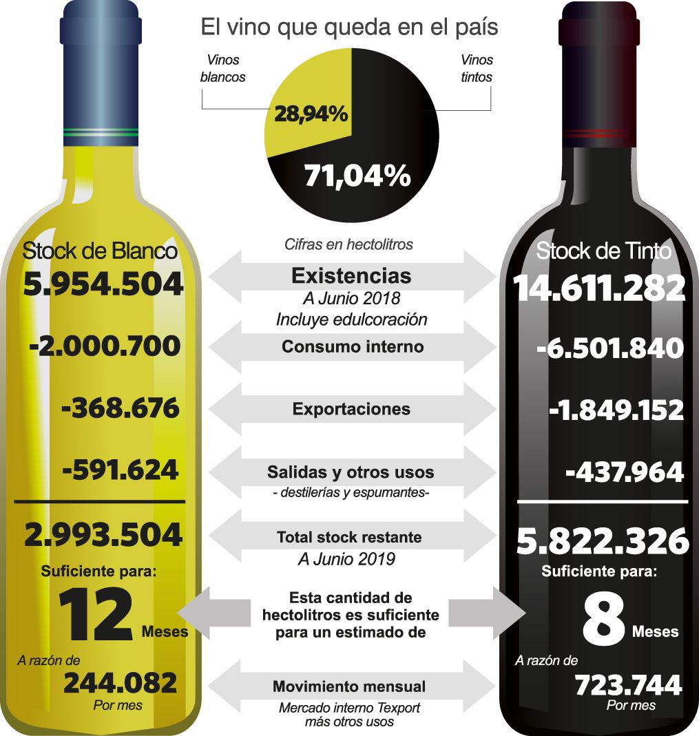 El vino tinto es el de mayor peso. Hay en este momento 14,6 millones de hectolitros (ver infografía), restándole el estimado que consumirán los argentinos, lo que se venderá al mundo y lo que irá a destilerías y espumantes quedan 5,8 millones de hectolitros equivalentes a 8 meses más de la misma comercialización. Es decir, el actual vino alcanza hasta febrero del 2020 sin contar la próxima vendimia. En vinos blancos el stock es de 12 meses. Un experto advirtió que el problema puede ser mayor ya que los cálculos se hacen con lo comercializado en el 2017 y en lo que va del año la exportación y consumo están cayendo.