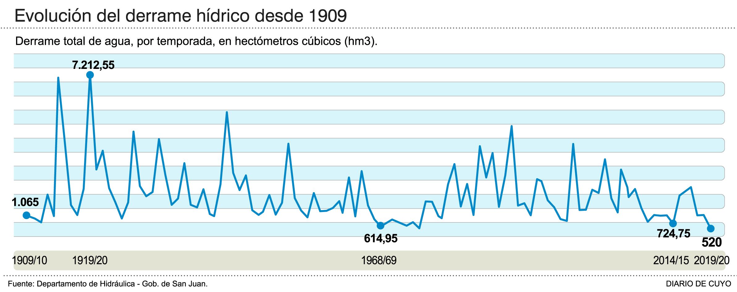 Con un escenario actual de grave sequía en la provincia de San Juan, que los pronósticos indican que empeorará la próxima temporada y se volverá a repetir un ciclo seco; los productores regantes junto a las autoridades de Hidráulica ya están planificando iniciativas para optimizar el manejo del escaso recurso para el 2021. Fundamentalmente se trabaja en la redacción de una "Ley de Sequía" que permita a la provincia poder obtener créditos nacionales para solventar con perforaciones de agua subterránea el faltante de agua estimado, que rondaría probablemente un tercio de la demanda actual. La norma reemplazaría a la actual Ley de Emergencia Hídrica (que incluye inundaciones), bajo el argumento de que la provincia transita 10 años seguidos de escasez y este verano es la peor sequía en 111 años, desde que Hidráulica empezó a tomar registros del caudal del río (ver infografia). Maximiliano Delgado, titular del Departamento de Hidráulica, informó que las Juntas de Riego de los departamentos han hecho una propuesta que cayó bien: consiste en realizar algún tipo de convenio con las perforaciones de los productores particulares, no sólo para que puedan regar en sus fincas sino también para volcar al sistema de riego y ayudar al resto, a cambio de que el gobierno suministre equipamiento o se haga cargo de la boleta de energía. Delgado confirmó que evalúan que este plan sería más económico y rápido que salir a poner en marcha más perforaciones estatales para suplir con agua subterránea el faltante que no podrán aportar los diques Caracoles y Punta Negra que este año quedarán secos. La financiación nacional sería para solventar las perforaciones privadas -no se sabe aún cuántas harán falta- y también para colocar paneles solares y reemplazar el costo de la energía eléctrica que es más cara. ""Existe predisposición, sabemos que salir a equipar perforaciones nuevas nos llevará mucho tiempo y si ya están hechas y no se están usando porque la boleta de luz es cara o porque no están en condiciones, podemos hacer un convenio con los usuarios", dijo Delgado. Bruno Perin, presidente de la Junta de Riego de Pocito, dijo que las Juntas están haciendo un censo entre los productores para ver cuántos pozos pueden aportar al plan. El año próximo la sequía se profundizará. Los cálculos que se analizan sobre la mesa son los siguientes: el mes pasado Hidráulica estuvo distribuyendo 44 m3/s diarios para las necesidades de la provincia desde los diques. De ellos, 24 m3/s vinieron del río. Con los 50 pozos estatales que salió a reparar el Gobierno este verano se aseguran unos 5 m3/s diarios extra. Pero el próximo verano no se contará con la reserva de los embalses, y si no nieva o llueve como indican los pronósticos y el río sigue trayendo apenas 24 m3/s en enero del 2021, habrá que suplir mediante la extracción de agua subterránea aproximadamente 15 m3/s diarios; es decir, un 34% de lo necesario.