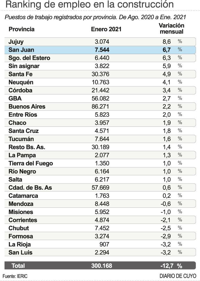 La construcción en San Juan este 2021 está en alza, y traccionó el aumento del empleo que las cámaras empresarias del sector atribuyen a la obra pública. En el último informe que acaba de publicar el Instituto de Estadística y Registro de la Industria de la Construcción -IERIC- se indica que en todo el país mejoró la actividad y la creación de empleo sectorial en enero, luego del descenso que había tenido en diciembre, pero hay tres provincias donde el salto fue muy significativo y una de ellas es San Juan. En enero, el volumen de ocupación en relación con el último mes de 2020 aquí repuntó un 6,7%, alcanzando los 7.544 trabajadores registrados y convirtiendo a esta provincia en la segunda del país que más empleos generó después de Jujuy (8,6%). En el tercer puesto se ubicó Santiago del Estero, con una variación mensual del 6,3% (ver infografía).