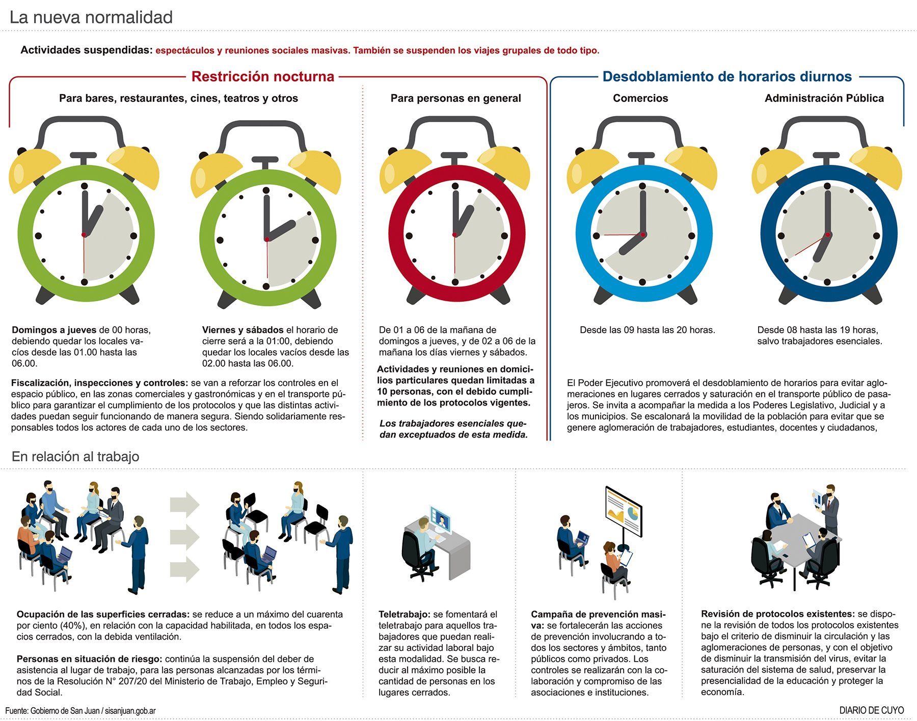 Si bien ayer hubo confusión respecto al horario de atención de los shoppings en San Juan, finalmente el ministro de Producción, Andrés Díaz Cano, informó que los espacios comerciales están autorizados para atender en el mismo horario que tenían hasta ahora, es decir, de 10 a 22 los negocios, mientras que los patios de comidas pueden hacerlo hasta la 1 de la mañana de todos los días, salvo viernes y sábado que es hasta las 2. El funcionario aclaró además, que los supermercados y negocios de alimentos tienen permitido trabajar de 8 a 22. Al respecto, la ministra de Gobierno, Fabiola Aubone, explicó que el parámetro de establecer horarios para el sector comercial es para evitar contagios en las paradas del transporte público, ya que como era la actividad hasta ahora, en los horarios picos se juntaban estatales, empleados de comercios y estudiantes.