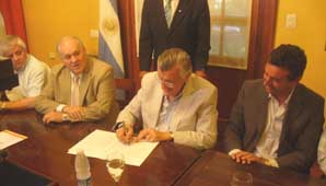 Hoy se concretó la firma del acta compromiso por parte del gobernador José Luis Gioja; el ministro de Minería, Felipe Saavedra; y los intendentes de Jáchal, Iglesia y Calingasta, Jorge Barifusa, Mauro Marinero y Robert Garcés, repsectivamente. También estuvo presente Enrique Uriburu por parte de Finning Soluciones Mineras S.A.; e Iván Malla, en representación de la entidad gremial minera.