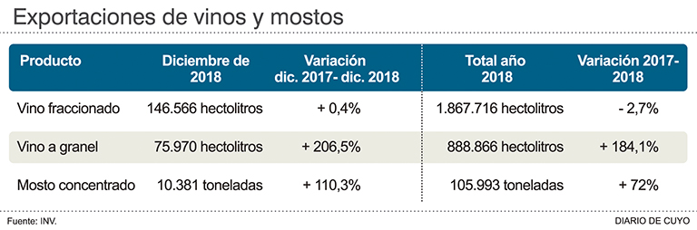 Las exportaciones argentinas de vinos a granel aumentaron 184,1% entre enero y diciembre de 2018, respecto del mismo período del año pasado, mientras que los envíos al mundo de vino fraccionado no lograron recuperarse y cerraron el año con una caída del 2,7%, informó el Instituto Nacional de Vitivinicultura.Las exportaciones del fraccionado ascendieron a 1,8 millones de hectolitros, de los cuales 287 mil correspondieron a blancos y 1,579.000 a tintos. Mientras los primeros tuvieron un descenso del 3,6% respecto a igual lapso del 2017, los de color, bajaron 2,6% en igual periodo.