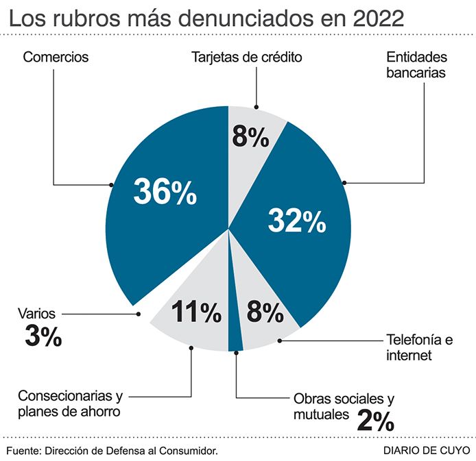 De 2.700 denuncias formuladas hasta el viernes pasado, el 36% fueron para el sector comercial, que volvió a encabezar la clasificación de reclamos tras tres años; en 2019 Comercio lideró el ranking de denuncias, para luego ser desplazado en 2020 y 2021 por Bancos. Este año las entidades financieras venían picando en punta hasta el mes pasado, pero en las últimas semanas fueron relegadas al segundo lugar (ver infografía), y las Concesionarias y planes de ahorro completaron el podio.