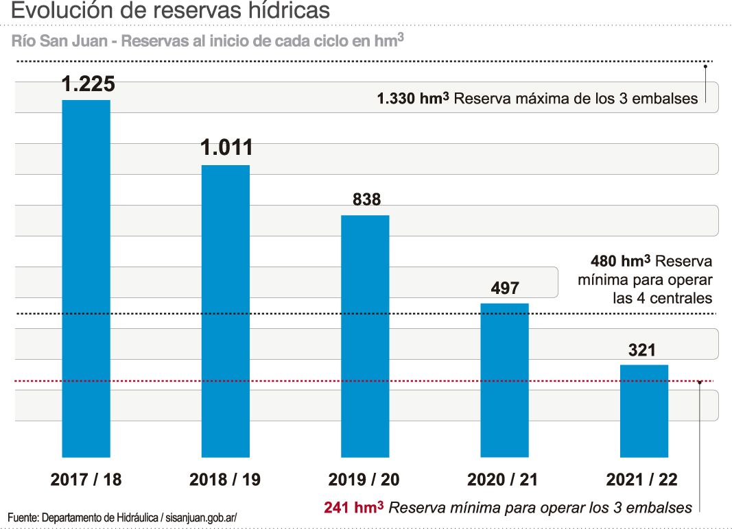 En medio de la histórica crisis hídrica por la que atraviesa la provincia, el secretario del Agua, Ramiro Cascón, salió a criticar la anterior administración del agua de los embalses porque dijo que "no fueron precavidos" e incluso habló de la "presión de los productores". El funcionario hizo el análisis con los últimos datos disponibles que anticipan que para el próximo ciclo hidrológico, que comenzará en octubre, la provincia tendrá la menor reserva en los 3 diques, Ullum, Punta Negra y Caracoles, de los últimos 5 años. Y es porque los 3 diques llegarán con unos 250 hm3, incluso por debajo a la medición del ciclo anterior, que comenzó con 321 hm3 (ver infografía). Para el período 2017/2018, 5 años atrás, los diques tenían embalsados 1.225 hm3, apenas a 105 hm3 de la capacidad máxima de los diques.