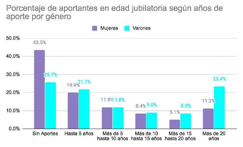 Un informe de la Dirección Nacional de Economía, Igualdad y Género del Ministerio de Economía demostró que casi el 89% de las mujeres de entre 54 y 59 años tiene menos de 20 años de contribución al sistema previsional, que requiere 30 años para tener un haber pleno.