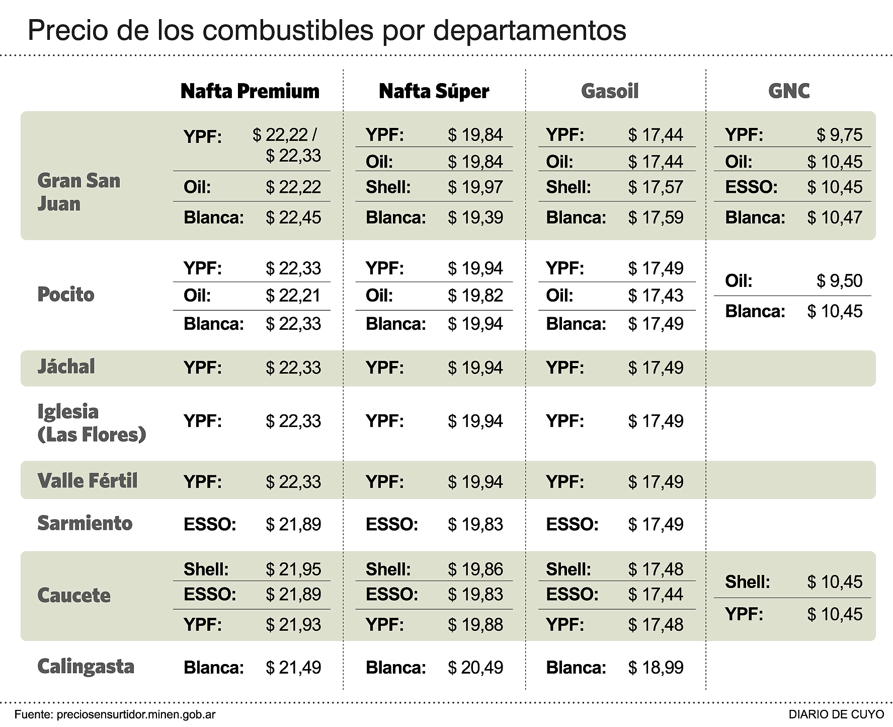 En general, los precios en los distintos departamentos son similares y sólo presentan algunos centavos de diferencia (ver infografía). En el caso del GNC, el valor más bajo es el de Pocito, donde una estación de la bandera Oil lo tiene a 9,50 el m3, mientras que en el resto de los lugares está a casi un peso más cara, incluso en el caso de Caucete, el departamento más alejado del Gran San Juan en contar con ese tipo de combustible.