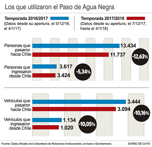 Desde que se abrió el Paso de Agua Negra esta temporada, 15.161 personas eligieron ir y venir por el camino cordillerano que une San Juan con la región chilena de Coquimbo, cifra que representa un descenso del 11% respecto a los 17.051 registrados por Gendarmería Argentina en la temporada 2016-2017. Si bien la caída es tenue, y las cifras pueden variar en lo que resta de la temporada que recién comienza, algunos referentes atribuyen la “ralentización” del flujo principalmente al impacto del aumento del dólar en los últimos días del 2017 y a la disminución de impuestos en electrónica, uno de los principales “ganchos” que impulsó la fiebre de compras a Chile. Esto confirma incluso lo que viene anticipando DIARIO de CUYO que sucede en las agencias de viajes locales, donde la venta de paquetes a la costa argentina repuntaron en el mismo momento en que el dólar pegó un salto. Los sanjuaninos temen que el encarecimiento del dólar les haga gastar de más en el exterior. Según los datos oficiales, en los primeros 29 días de funcionamiento del paso (desde el 7 de diciembre al 4 de enero) cruzaron hacia Chile 11.737 personas y entraron desde allá a la provincia otras 3.424 (ver infografía). Son 1.890 menos que la temporada pasada, aunque en aquella oportunidad abrió dos días antes -el 5 de diciembre de 2016-, y ahora lo hizo el 7 de diciembre. Pero aún quitando el flujo de esos días, el número de personas y de autos es menor. Elena Peletier, secretaria de Relaciones Institucionales, dijo que es “”pronto” para analizar el comportamiento del paso, algo que recién deberá hacerse al terminar el mes de enero. Opino que la baja se debe a que esta temporada el paso abrió más tarde, y muy encima del feriado largo del 8 de diciembre. “Mucha gente no se enteró, no logramos difundir demasiado y muchos no pudieron planificar el viaje como la temporada anterior”, dijo. Peletier en cambio destacó que las semanas de Navidad y de Año Nuevo se produjo un repunte de personas frente a igual lapso del año anterior. Efectivamente, entre el 18 y el 25 de diciembre cruzaron 540 autos y 1.900 personas por el paso, frente a 433 autos y 1.453 personas del 2016. Y mejor fue para Año Nuevo: entre el 26 de diciembre de 2017 y el 1 de enero de 2018 pasaron 1.721 vehículos y 6.854 personas, frente a 1.584 autos y 6.411 personas registradas en la temporada anterior. Pese a esa mejora, Peletier desmintió rotundamente las cifras difundidas por la Gobernación de El Elqui en los últimos días, que indican un aumento del 74% de argentinos que usaron el paso respecto a igual lapso del año pasado.