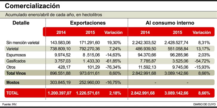 La industria del mosto cerró el primer cuatrimestre del 2015 con números en rojo, ya que no sólo acumula caídas en volumen exportado -de casi 17%- sino que con un precio internacional planchado desde hace tres meses, y que está a la mitad de los valores del año pasado a esta altura; la facturación descendió casi al 40 por ciento entre enero y abril, según reflejan las cifras del Instituto Nacional de Vitivinicultura al mes de abril pasado. El dato golpea a la economía sanjuanina ya que el mosto es uno de los principales productos de su vitivinicultura. Ese mes se contabilizó una merma del 11,69 por ciento en volumen, y del 37,47% en dólares, comparadas con abril de 2014. Así, en el acumulado del cuatrimestre, se aprecia una caída del 39,8% en el valor Fob y del 16,75% en volumen, en relación al mismo lapso del año anterior.