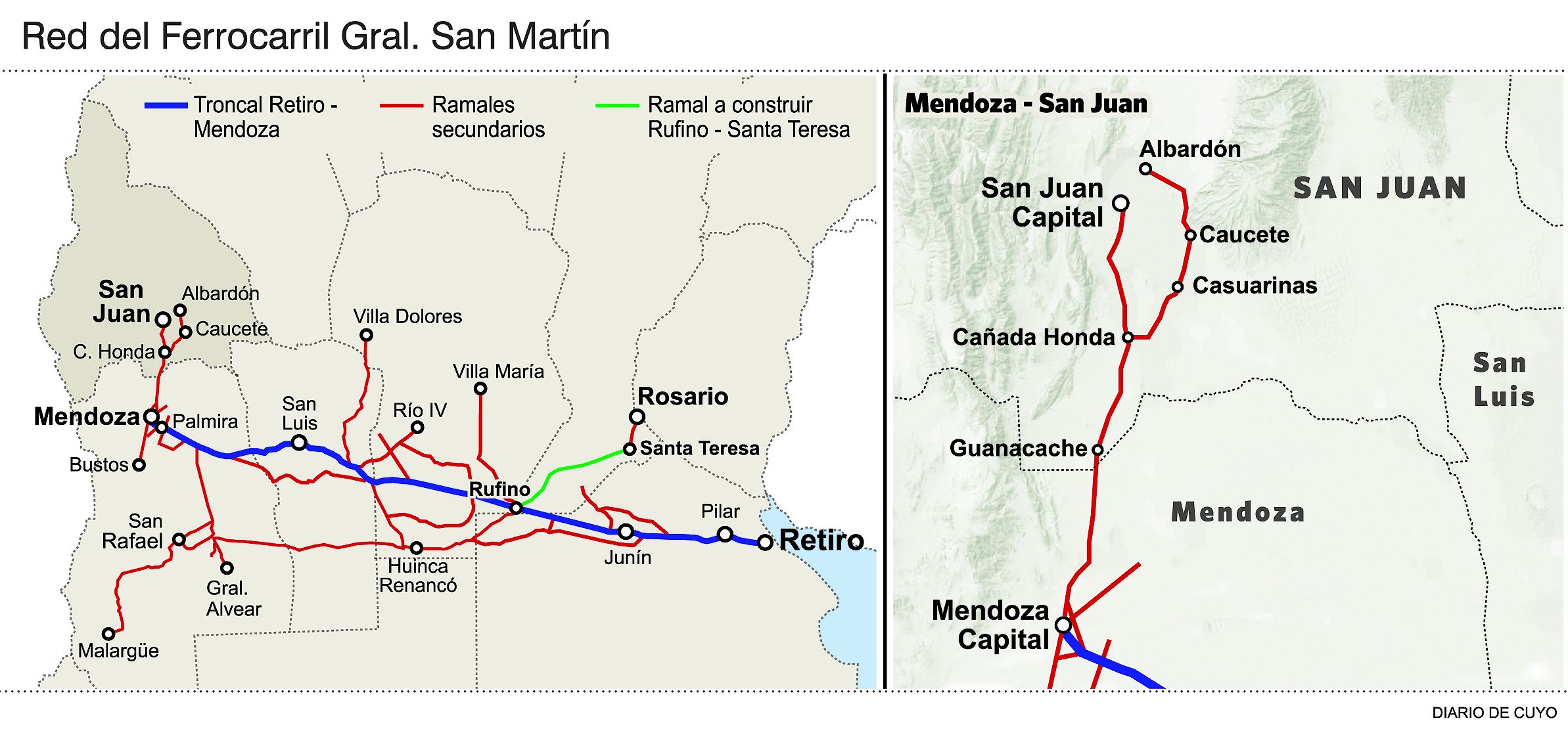 El ministro Díaz Cano destacó que la recuperación del tren es preocupación central del Gobierno sanjuanino al punto que desde el año pasado está el ofrecimiento local de encarar la refacción con fondos propios de dos estaciones de trenes sanjuaninas -la de Albardón y la de Angaco- para reactivar rápidamente el ramal ferroviario a pleno y permitir que los productos de la provincia salgan a menor costo. La importancia de reflotar estas estaciones e incorporarles grúas para manipulación de contenedores es que permitirá ampliar el servicio del tren de carga al sector agroindustrial sanjuanino para abaratar fletes. Actualmente el servicio de carga funciona en forma deficiente, de modo que sólo es utilizado por empresas mineras y bodegas para trasladar mineral y vinos.