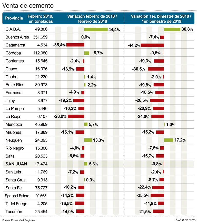 La crisis económica impactó con fuerza en la demanda de uno de los principales insumos de la construcción, como es el cemento cuyo consumo bajó en todo el país en lo que va del 2019. No obstante, en el primer bimestre del año; San Juan es la segunda jurisdicción donde menos cayó su uso (levemente por debajo de Córdoba (ver infografía)- y es la obra pública la que pudo amortiguarla.