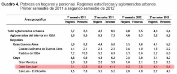 San Juan 24 de abril.- En la tarde de hoy, el Instituto Nacional de Estadísticas y Censos, INDEC, dio a conocer los resultados del último semestre de 2012 respecto los índices de pobreza e indigencia en el país. En el desagregado por región y provincias, surge que la pobreza en San Juan cerró el año pasado en el 5,8%, habiendo dejado atrás los 2 dígitos con los que cerró el 2011, 11,1%. Respecto a la indigencia, la cifra fue mucho mayor habiendo quedado prácticamente erradicada alcanzado solo el 0,8% del total de la población.