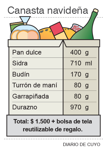 El acuerdo de precios de la Canasta Navideña se logró con 26 supermercados y autoservicios sanjuaninos, donde se podrá comprar 6 productos de primera calidad a $1.500 que se entregan con una bolsa de tela reutilizable de regalo. Se trata de un combo de pan dulce, una sidra, un budín, un turrón de maní, garrapiñada y una lata grande de duraznos.
