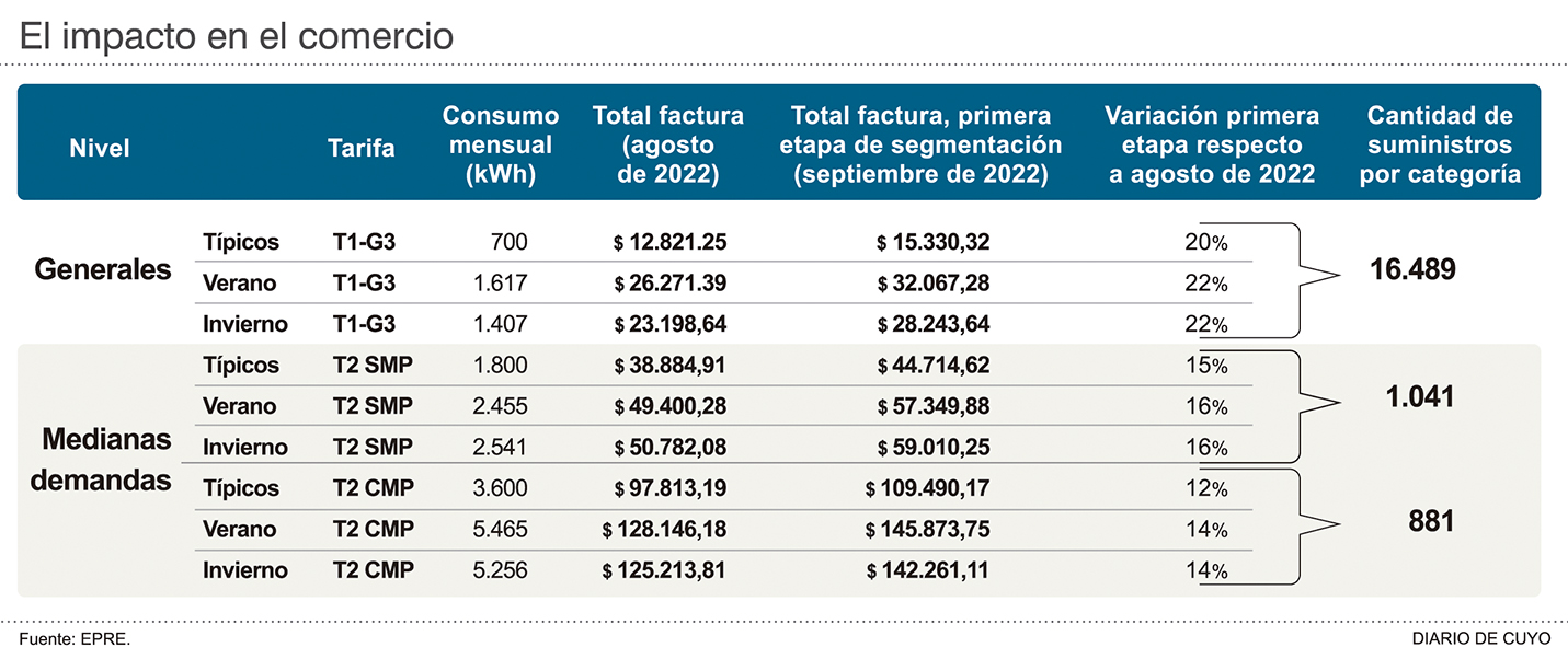 La quita de subsidios a la electricidad al comercio, el primer sector del que se conocieron detalles y que entrará en vigencia a partir de hoy, según confirmaron ayer desde el Ente Provincial Regulador de la Electricidad (EPRE), significará que los negocios de la provincia, que suman 18.411 suministros, tendrán un impacto en las boletas que irá desde al 12 al 22%, durante los dos próximos meses, dependiendo de los consumos. Para los que gastan entre 700 y 1.407 kWh, que suman 16.489 suministros, el 89,5% del total, será el sector más afectado porque la suba irá desde el 20 a 22% y que deberán afrontar con las facturas que les empezarán a llegar entre mediados de octubre y los primeros días de noviembre. Frente a este panorama, desde las cámaras del sector en la provincia anticiparon la intención de agruparse, incluso con representantes de las provincias de la región, como Mendoza y San Luis, para hacer un planteo común ante las autoridades nacionales por el fuerte impacto que tendrá en el sector.