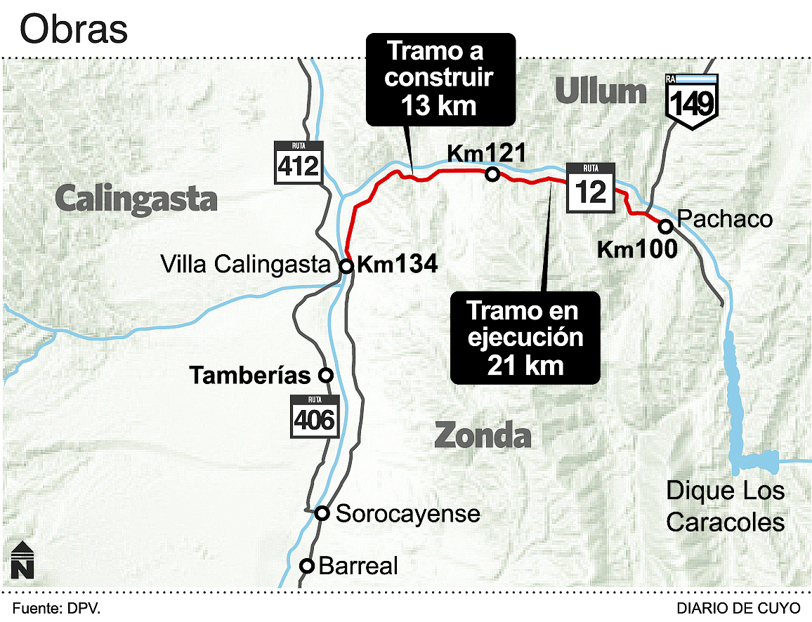 Con esta obra se completará el último tramo de la Ruta Provincial 12, desde Pachaco hasta la Villa Calingasta, según explicó el titular de Vialidad Provincial, Juan Magariños. Para su construcción, la obra se dividió en 2 sectores. El primero, actualmente en ejecución por la empresa José Cartellone Construcciones Civiles, es de 21 kilómetros y se lo conoce como sección 1A, que va desde el kilómetro 100 al 121. Tiene un presupuesto oficial de 434 millones de pesos y según los plazos previstos, deberá estar terminado en septiembre de este año. El otro, que estará a cargo de la constructora Mapal, es la llamada Sección II y va desde el kilómetro 121 al 134 y finaliza en el puente de Calingasta, la puerta de acceso a la villa cabecera.