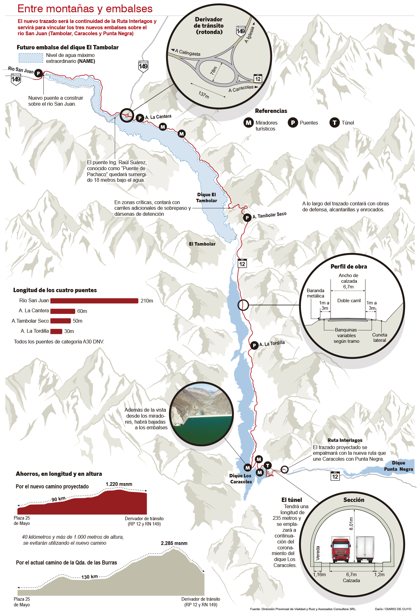 De acuerdo a los cálculos de la consultora Ruiz y Asociados que tardó un año en hacer el proyecto, se ahorrarán 40 kilómetros por esta vía que bordeará los diques. ‘’No es poco, es casi una hora de viaje, con ventajas económicas para el transporte de la producción, para las ambulancias’’, destacó Magariños. A la menor distancia se agrega otro beneficio: el futuro camino estará a 1.220 msnm, mucho más bajo que los 2.285 msnm que sortea la actual ruta 149. Sin embargo la nueva ruta 12 no se parecerá al trazado original. El jefe de proyecto, Oscar Andino, explicó que se consideró mas conveniente reformular la ruta por la margen izquierda del río, y no por la margen derecha como era antes. Se hará una nueva traza desde la ruta 149 y zona aledaña al puente Ingeniero Raúl Suárez (ver infografía), más conocido como Pachaco, que también quedará sumergido con la cola del futuro Tambolar. Por allí cerca se hará un nuevo puente más chico, y un gran derivador de tránsito, en tanto que la ruta aguas abajo bordeará la margen izquierda del río por zonas de planicies y menos acantilados que la vieja ruta; hasta desembocar en un túnel de menso de 240 metros que saldrá a la altura del coronamiento del dique Caracoles. Desde allí se hará una mejora en la actual traza para darle menos pendiente y enlazara con el tramo de la Interlagos que comunica con el dique Punta Negra y la ex calle Las Moras en Zonda.