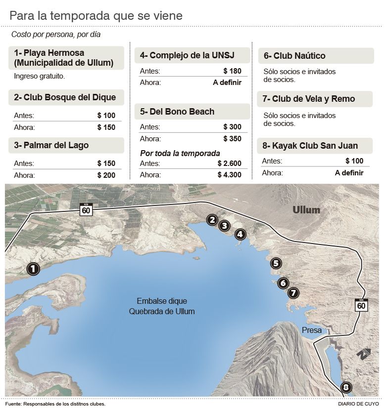 Para comerse un asado en las costas del dique o pegarse un chapuzón ya sea en las aguas del embalse o en las piletas que tienen la mayoría de los complejos, el valor de las entradas, aun cuando algunos clubes todavía no las han fijado, viene con un aumento que oscila entre el 30% y que puede superar el 60%. Los montos parten desde los 150 por persona y por día, como en el caso del Club Bosque del Dique, o los 350 pesos en el Complejo Del Bono Beach, claro que allí hasta van a inaugurar un club de niños, un espacio para la recreación de los más pequeños.