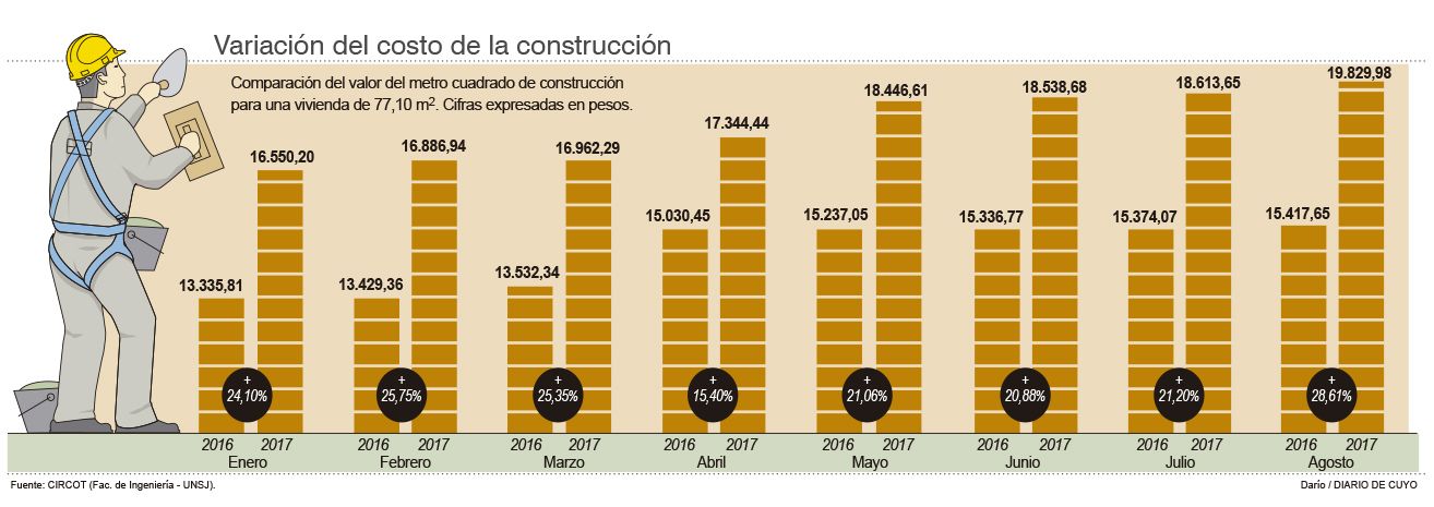 El precio de construir una casa en San Juan se hace cada vez más cuesta arriba. En agosto el costo del metro cuadrado quedó a pasos de los 20 mil pesos -llegó exactamente a 19.829,98 pesos-, un aumento del 6,43% respecto a julio y un incremento del 28,61% comparado con agosto de 2016, impulsado por alzas en el valor de los materiales y de la mano de obra; según el último dato calculado por el Centro de Investigación de la Construcción Tradicional (Circot), de la Facultad de Ingeniería de la provincia. De este modo, desde este mes el costo para levantar una vivienda tipo, de 77 metros cuadrados con tres dormitorios como la que calcula la entidad, supera el millón y medio de pesos. Con los últimos incrementos, hacen falta 1.528.891,17 pesos, una cifra bastante difícil de alcanzar para una familia de ingresos medios, y directamente imposible para un hogar de bajos recursos.
