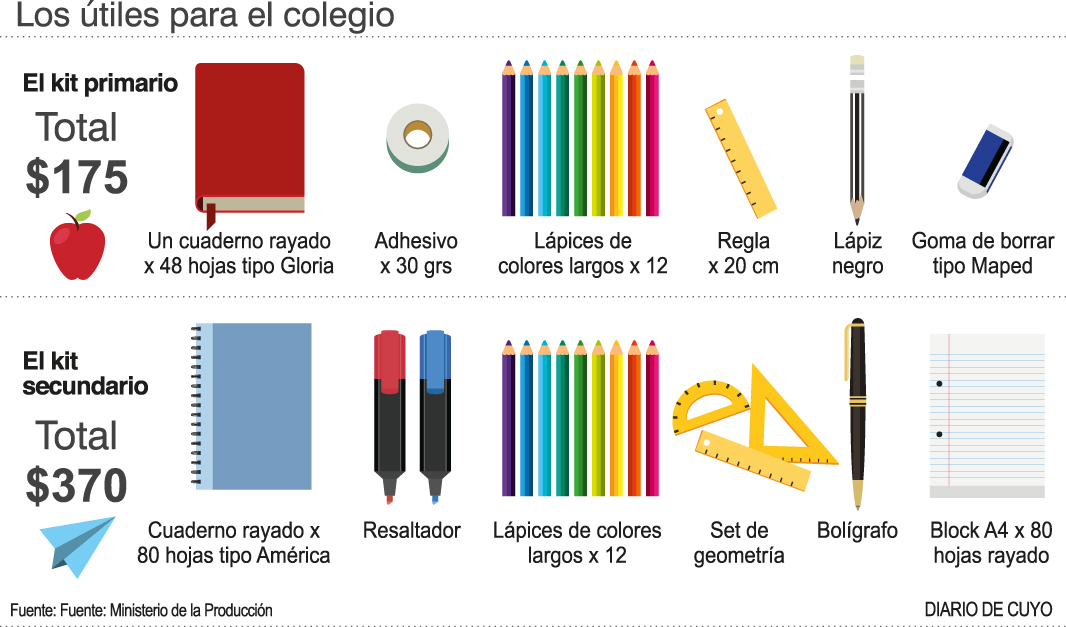 Ahora cada kit contiene elementos diferenciados por el nivel escolar (ver infografía). Por ejemplo cuadernos, adhesivos, lapiceras, lápices, gomas y un set de geometría.