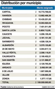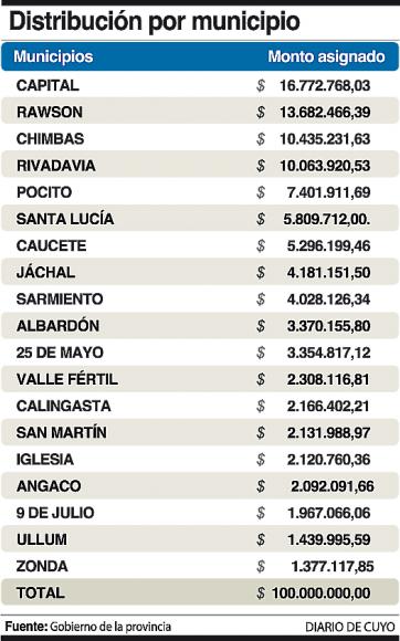 Como en el esquema que se genera cada año, Capital será quien reciba más fondos con $16.772.768,03, no porque tenga más población, ya que Rawson es el municipio más poblado según el censo del 2010, sino porque cuenta con más infraestructura escolar y las infraestructuras en seguridad.