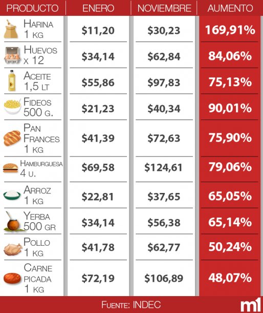 El caso más emblemático es el de la harina que acumula una alza del 169,91% en lo que va del año. La disparada del precio de la harina desde que asumió Mauricio Macri la presidencia está directamente ligada a su decisión de eliminar las retenciones al trigo. Al hacerlo, Macri dolarizó el precio de la harina y la abrupta devaluación del peso frente al dólar registrada este año explica la disparada.