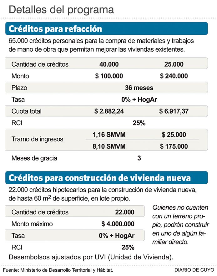 Los créditos para refacción y construcción de viviendas del programa Casa Propia que anunció ayer el Gobierno nacional fueron bien recibidos por referentes de la construcción sanjuaninos que creen que darán un impulso al sector, aunque esperan conocer mayores detalles de su implementación. Qué cupos le corresponderán a San Juan, cómo serán los sorteos y si habrá diferenciación de sueldos por regiones o la posibilidad de presentar los ingresos del grupo familiar son algunos de los pormenores que los intrigan. El Gobierno nacional lanzó 87.000 créditos a tasa cero de interés, para la refacción y construcción de viviendas en todo el país, en el marco del programa federal Casa Propia (ver Cómo son los nuevos créditos). Serán entregados por el Banco Hipotecario y la principal característica es que se ajustarán por la fórmula Hog.Ar de actualización de capital basada en la evolución de los salarios, y no como los que hay hasta ahora (UVA) que se actualizan por inflación. ""Indudablemente es un buen comienzo, va en sentido correcto", dijo el presidente de la Cámara Argentina de la Construcción (Camarco) de San Juan, Julián Rins. Agregó que la entidad aplaude la iniciativa que tomó el sector público, ante la ausencia de créditos hipotecarios de la banca privada y consideró que impulsará la actividad aunque la dimensión depende de cómo se distribuya. ""Evidentemente va a tener algún sistema de distribución que aún no sabemos, porque van a haber mucho más interesados que créditos", dijo Rins. ""Consideramos que es el camino correcto pero no podemos decir aún si va a ser bueno porque no conocemos la distribución y tratándose de un programa específico no va a cubrir todas las necesidades que hay", señaló. En tanto, el presidente de la Cámara Empresarial de la Construcción, Enrique Velasco, dijo que cualquier incentivo que haga que la construcción tome mayor impulso ""nos parece bárbaro". Detalló que San Juan llegó al mínimo de ocupación y desde fines del año pasado se ha venido recuperando, "pero aún falta mucho" para llegar a los niveles normales. ""Las líneas parecen ser muy atractivas, habría que ver los montos mínimos que requieren porque los sueldos en Buenos Aires son muy distintos a los de las provincias. La cuota es un porcentaje de los ingresos y eso va a condicionar también el monto del préstamo al que se puede acceder", opinó, y se preguntó si el programa admitirá que se junten los sueldos del grupo familiar para el acceso al crédito. Respecto a las líneas de refacción, dijo que le hace ""ruido" porque en general la gente no contrata a empresas sino a cuadrillas o albañiles que las hacen como changa y en negro, con lo cual habrá que ver qué exigencias va a tener el banco Hipotecario al respecto. El empresario ferretero Guillermo Cabrera se mostró optimista con el anuncio, y dijo que "indudablemente todo lo que sea una inyección para la construcción ya sea refacción o construir casas nuevas, es positivo porque le inyecta al mercado, al circuito financiero, un dinero está haciendo mucha falta en este momento". En segundo lugar destacó que le dará la posibilidad a la gente de poder restablecerse y encaminarse construyendo o refaccionando lo que necesite. ""Es una buena medida y espero que llegue una buena cantidad para San Juan. Por el momento son pocos préstamos, pero lo que nos toque va a ser bienvenido", indicó.