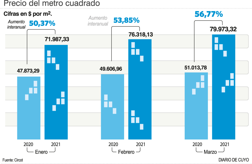 En lo que va del año el metro cuadrado ya acumula un aumento del 11,09% y los mayores saltos se produjeron en febrero y marzo. Enero sólo aumentó 0,28% respecto a diciembre del 2020, por el incremento de materiales de construcción. Luego, febrero pegó un salto de 6%, empujado por estos mismos insumos que se dispararon 11,48%.