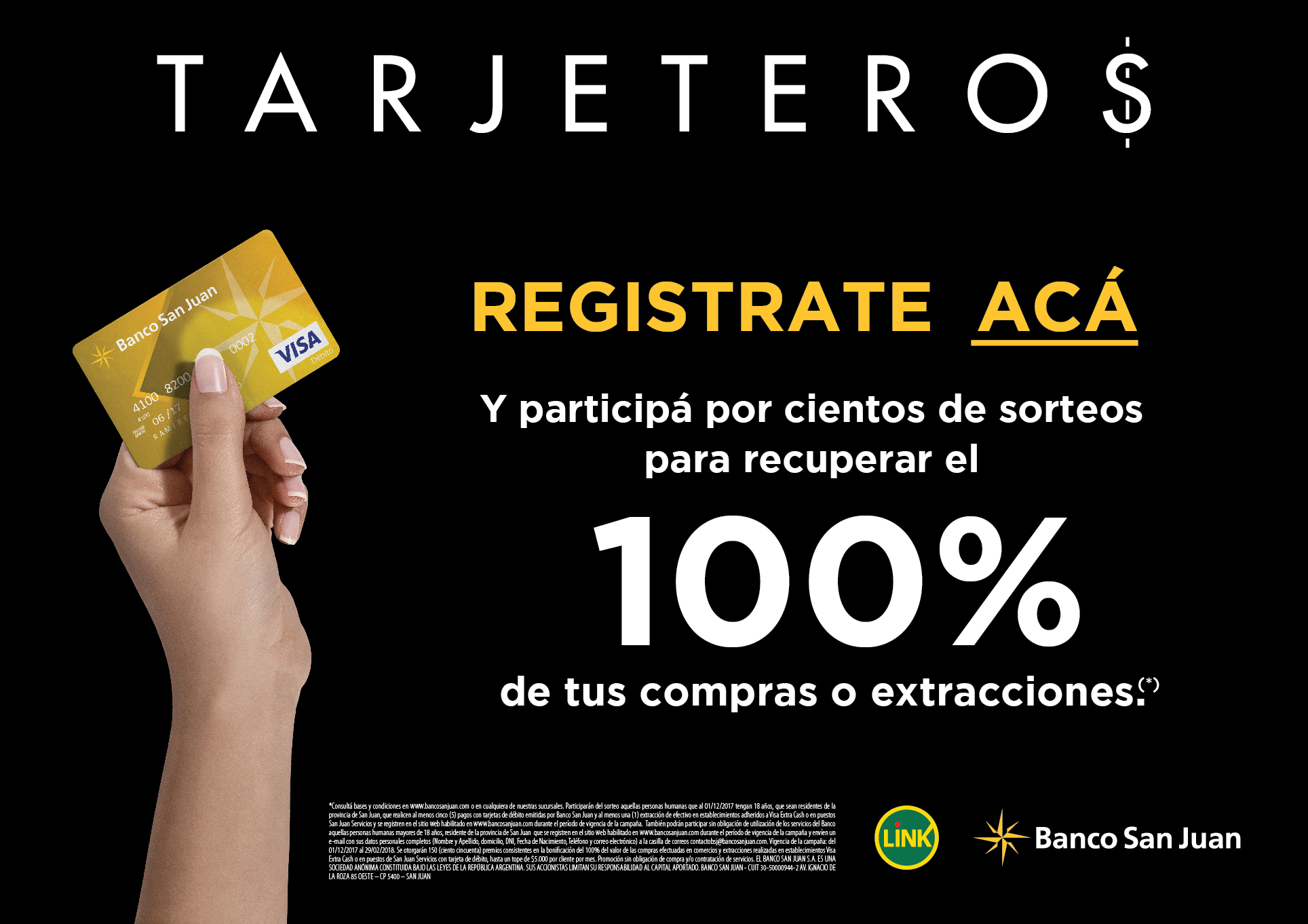 Banco San Juan lanzó una nueva campaña para sus clientes, denominada “Tarjeteros”, la cual busca incentivar el uso de la Tarjeta de Débito Visa como medio de pago en comercios y para la extracción de dinero en los puntos San Juan servicios y locales adheridos a Visa Extra Cash.