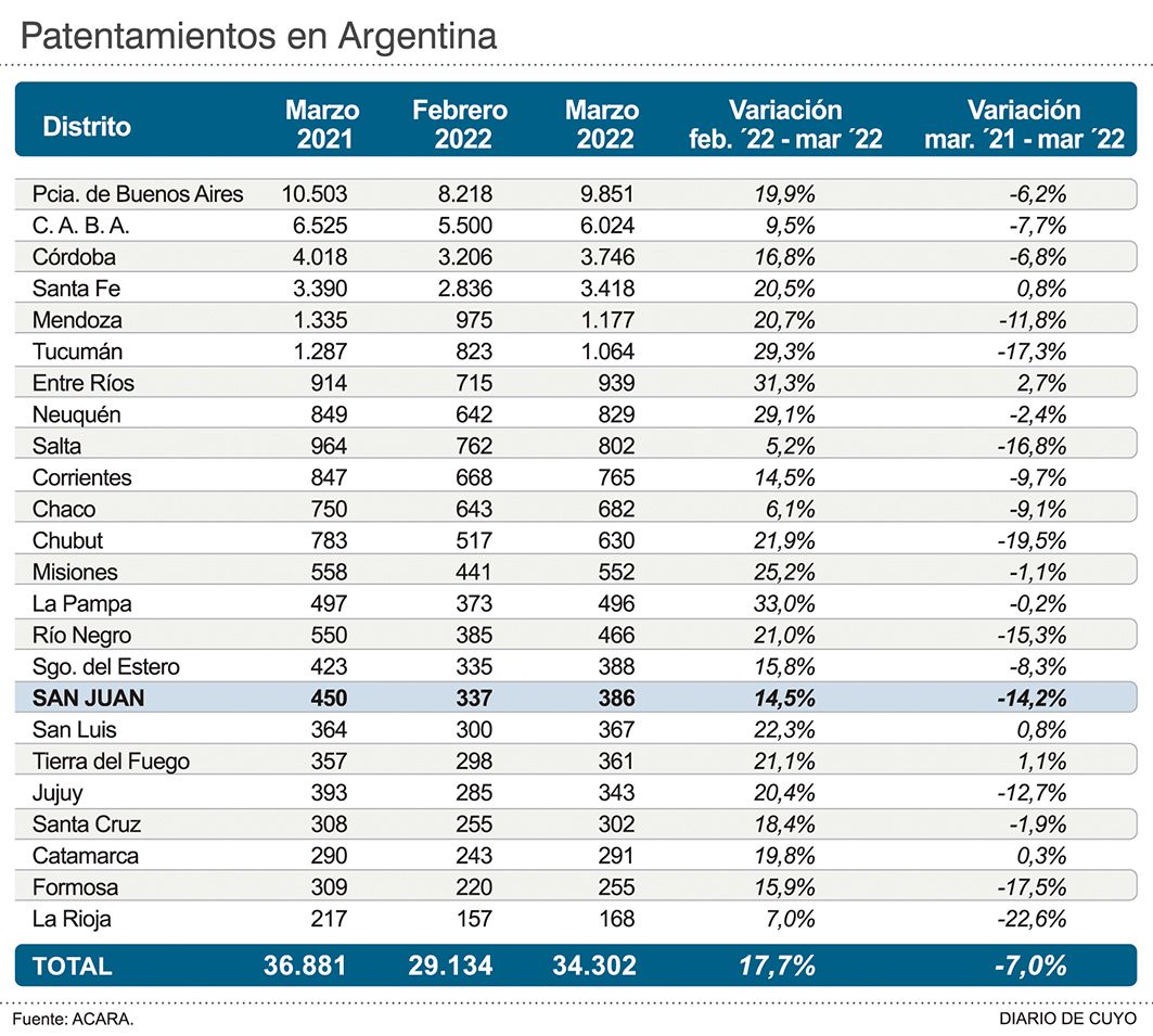 La Asociación de Concesionarios de Automotores de la República Argentina (ACARA) informa que el número de vehículos patentados durante marzo de 2022 ascendió a 34.302 unidades, lo que representa una suba del 17,7% ya que en febrero pasado se habían patentado 29.134 unidades. Si la comparación es interanual se observa una baja del 7% ya que en marzo de 2021 se habían registrado 36.881 unidades. De esta forma en los tres meses acumulados del año se patentaron 106.978 unidades, esto es un 8,6% menos que en el mismo período de 2021, en el que se habían registrado 117.091 vehículos.