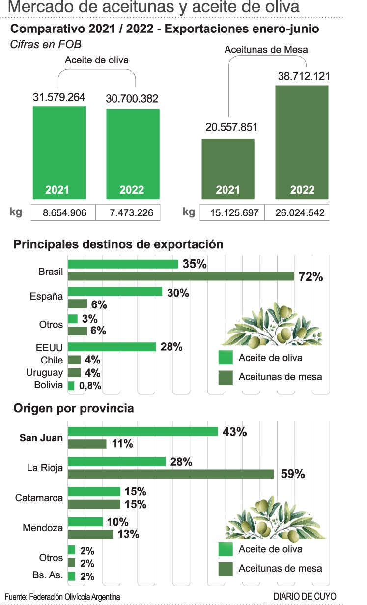 Patricia Calderón, presidenta de la Federación Olivícola Argentina, informó que las exportaciones de aceite de oliva argentinas en el primer semestre del 2022 alcanzaron los 7,4 millones de kilos, por un precio Fob de U$S 30,7 millones. El 43% de esa exportación corresponde a la provincia de San Juan, el principal productor del país de AOVE (ver infografía). Asimismo, las exportaciones de aceituna en conserva fueron 26 millones de kilos en el primer semestre de este año, por U$S 38,7 millones. El 11% de esa exportación corresponde a San Juan, la cuarta provincia tras La Rioja, Catamarca y Mendoza. En total, la cadena olivícola del país (aceite más conserva) subió 40,86% el volumen exportado en el primer semestre 2022 comparado con el 2021; mientras que la facturación en dólares creció un 33,13% el igual periodo.