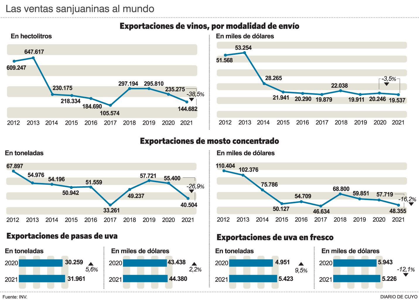 También aumentaron las exportaciones de pasas y de uvas de mesa, aunque el mosto -uno de los productos de peso entre las exportaciones sanjuaninas- se derrumbó en el 2021 al caer 26,9% la venta de concentrado, y 16% el ingreso de divisas comparado con el año anterior.