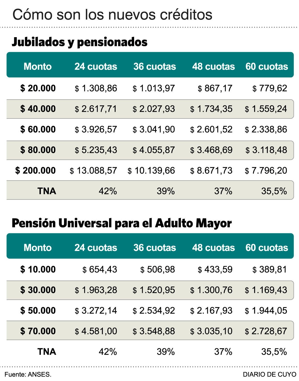 Para beneficiarios de la Asignación Universal por Hijo (AUH) y de Asignaciones Familiares los créditos son de hasta 12.000 pesos por hijo, antes eran de 7.500 pesos, en 24 o 36 cuotas, mientras quienes reciben una Pensión No Contributiva (PNC) o una Pensión Universal para el Adulto Mayor (PUAM) pueden solicitar hasta 70.000 pesos a pagar en 24, 36, 48 o 60 cuotas. A mayor cantidad de cuotas, la tasa es más baja.