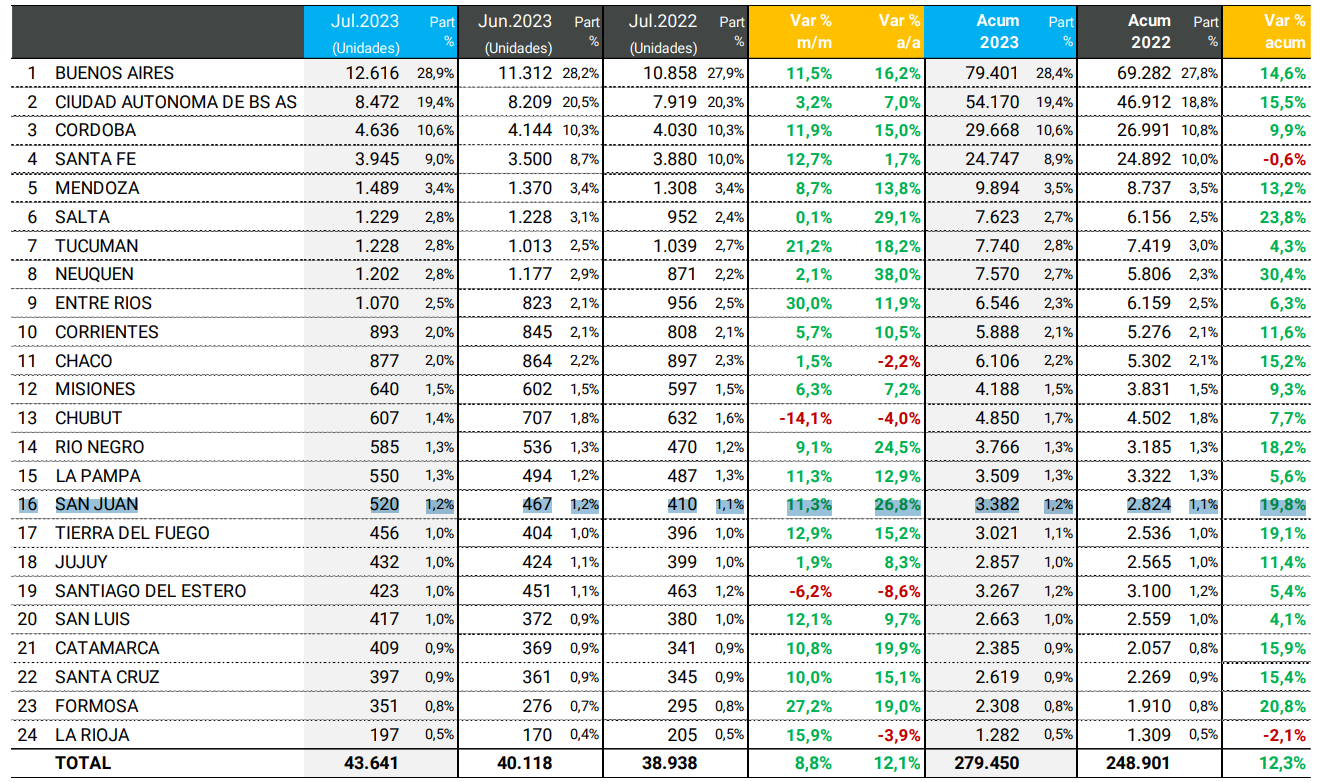 En el caso de San Juan, el séptimo mes del año arrojó un crecimiento del 11,3% frente al mes pasado y del 26,8% frente a julio del 2022. Así las cosas, en el acumulado el crecimiento interanual alcanza el 19,8%, muy por encima del 12,3% del promedio país.