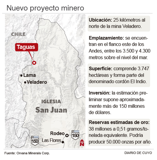 El proyecto iglesiano Taguas nació del grupo de prospectos que exploró Minera Aguilar, que después de hacer la factibilidad de Pachón a fines de los años "70, modificó la búsqueda de cobre por oro, tras el descubrimiento del denominado Cordón del Indio. Aguilar pasó años después a manos de Glencore y el grupo de exploraciones se mantiene y se transforma en Compañía Minera Piuquenes. El gerente de esta última compañía, Sergio Palma, explicó que desde ese momento también se cambió el enfoque y en vez de buscar vetas de alta ley como era antes, se moderó la exploración a zonas de ley baja o moderada, que puedan ser lixiviadas. Allí surgió Taguas, y como Piuquenes es accionista principal de la productora Orvana, esta se hace cargo del 100 por ciento del proyecto sanjuanino a partir del año 2019. Orvana tiene en producción una mina de oro al norte de Asturias en España, y otra en Santa Cruz, Bolivia. Ahora apunta a San Juan.