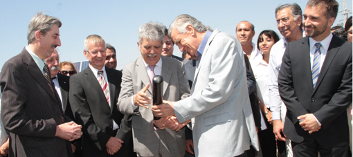 San Juan, 24 de octubre.- Con 1.574 millones de pesos de inversión en su haber, este mediodía se colocó la piedra fundacional de la fábrica de paneles solares en un predio de 9 de Julio, que se estima esté lista en diciembre del 2015. Del acto participaron el ministro de Planificación Federal, Julio De Vido, junto al gobernador Gioja y el embajador de Alemania en la República Argentina, además de los directivos de la compañía teutona encargada de la obra, Schmid Group.