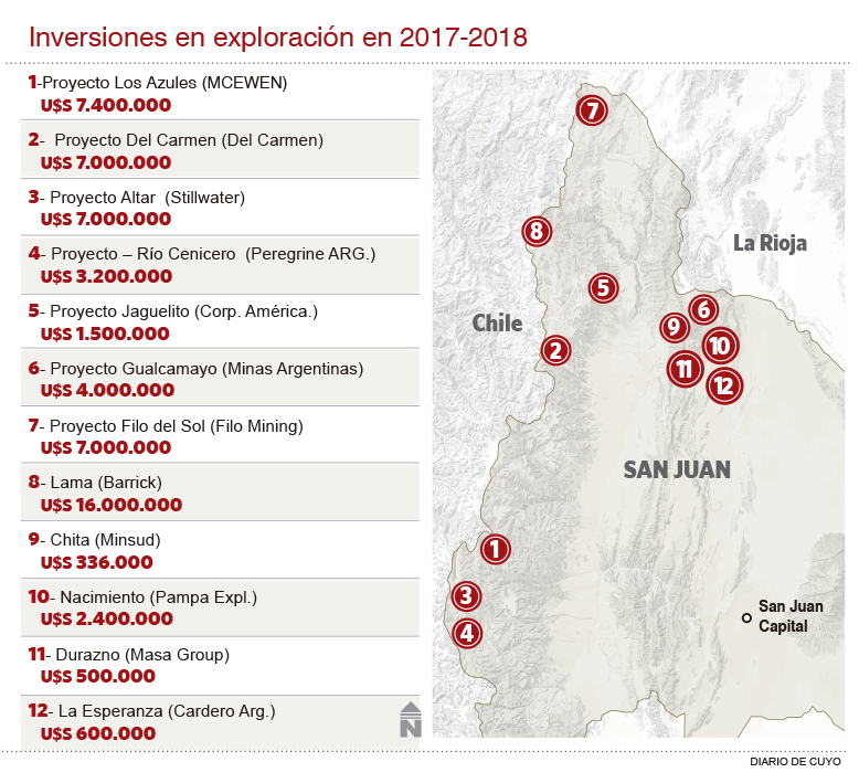 Para esta temporada, la mayor inversión en exploración minera es la de la sociedad de Barrick con la china Shandong Gold, para la mina Lama, en la que han destinado 16 millones de dólares (poco más de 276 millones de pesos), que no estaba en la temporada anterior. Le sigue en orden de importancia el proyecto Los Azules (Mcewen), con 7,4 millones de dólares (128 millones de pesos) y luego siguen Filo del Sol (Filo Mining), Altar (Stilwater) y Del Carmen (Del Carmen), con 7 millones de dólares cada uno (121 millones de pesos). Con 4 millones de dólares (69 millones de pesos) sigue el proyecto Gualcamayo (Minas Argentinas), que actualmente está en explotación, y Río Cenicero (Peregrine Arg.) con 3,2 millones de dólares (55 millones de pesos) y Nacimiento (Pampa Exploraciones), con 2,4 millones de dólares (41 millones de pesos). En el proyecto Jaguelito (Corp. América) invertirá 1,5 millones de dólares (casi 26 millones de pesos) y con menos de 1 millón de dólares están Chita (Minsud), Durazno (Masa Group) y La Esperanza (Cardero Arg).
