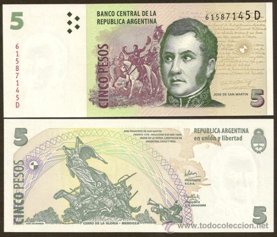 Al tratarse del billete de menor denominación, el papel de 5 pesos sufre un deterioro más veloz que el resto de los billetes. Actualmente, circulan 510,6 millones de unidades de este billete, con la imagen del General José de San Martín en su anverso, que se emitió a partir de 1998, dijo la autoridad monetaria en un comunicado.