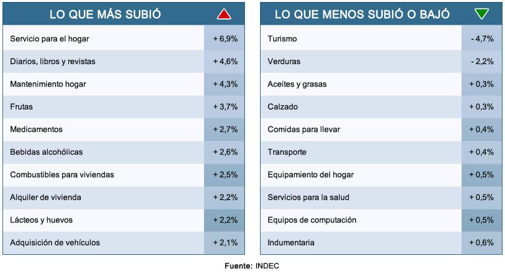 En el desglosado, los servicios para el hogar (+6,9%), diarios, libros y revistas (+4,6%), mantenimiento del hogar (+4,3%), frutas (+3,7%) y medicamentos (+2,7%) fueron los rubros cuyos precios más se incrementaron respecto a abril. Por el contrario, turismo (-4,7%) y verduras (-2,2%) fueron los dos únicos rubros que registraron una caída de los precios según las mediciones del Indec.