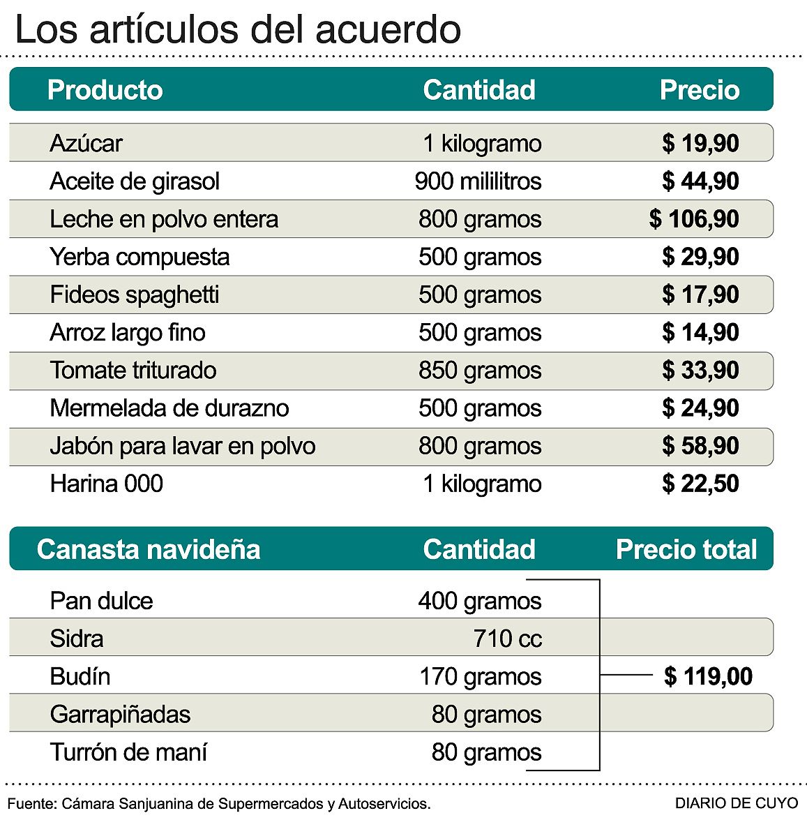 No hay límite de compras y el cliente podrá adquirir tantas como le permita el bolsillo. Se trata de una canasta navideña que desde hoy estará disponible para las compradores, por iniciativa de la Cámara Sanjuanina de Supermercados y Autoservicios (CASSA), que agrupa a los supermercadistas locales. Contendrá 5 artículos, un pan dulce de 400 gramos, una sidra de 710 cc, un budín de 170 gramos, un paquete de garrapiñadas de 80 gramos y un turrón de maní de 80 gramos, todo por 119 pesos. Lo bueno es que resultará hasta un 33% más económica que lo que valen esos artículos en la actualidad, según un sondeo entre los comerciantes del sector.