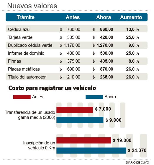 Las aranceles fijos que cobran los registros del automotor tuvieron un incremento de hasta un 26% en promedio, según lo dispuesto por la Dirección Nacional de los Registros Nacionales de la Propiedad del Automotor (DNRPA), que depende del Ministerio de Justicia y Derechos Humanos. Así, por ejemplo, un trámite común como es solicitar la tarjeta verde pasó de los 335 pesos a 420 pesos (25%), mientras que el costo del título del vehículo trepó de los 210 pesos a los 265 pesos (26%). Pero no fue lo único que subió, sino que también ascendió el costo de transferir un vehículo o registrarlo si se trata de un 0 Km, dependiendo de la valuación de la unidad, que se modificó hasta un 28%. Así las cosas, transferir un auto mediano 2006 ahora tiene un costo de unos 9.000 pesos, mientras que para inscribir uno nuevo, también un mediano, hay que pensar en más de 24.000 pesos.